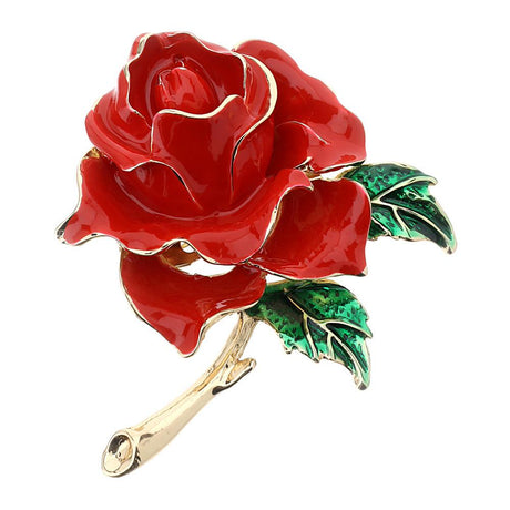 HERVIT - Spilla Rosa Rossa Foglioline Verdi 6X7Cm