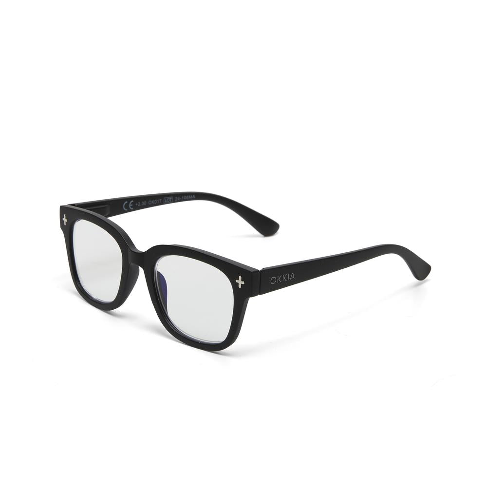 Occhiali da lettura con filtro luce blu +1.00, cerniere a molla, finitura nero/grigio – Magframe. Design contemporaneo firmato Okkia per una visione nitida e protetta durante la lettura e l’utilizzo dei dispositivi 👓.