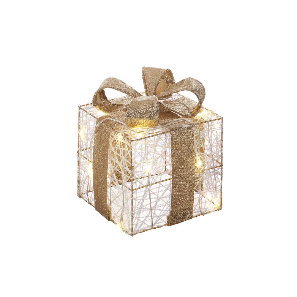 Pacco regalo luminoso “Doni delle Stelle” piccolo con 20 LED – 15×15×18 cm. Decorazione da appoggio dal design elegante che diffonde un bagliore suggestivo, ideale per creare un’atmosfera natalizia magica in ingressi, salotti e vetrine ✨.