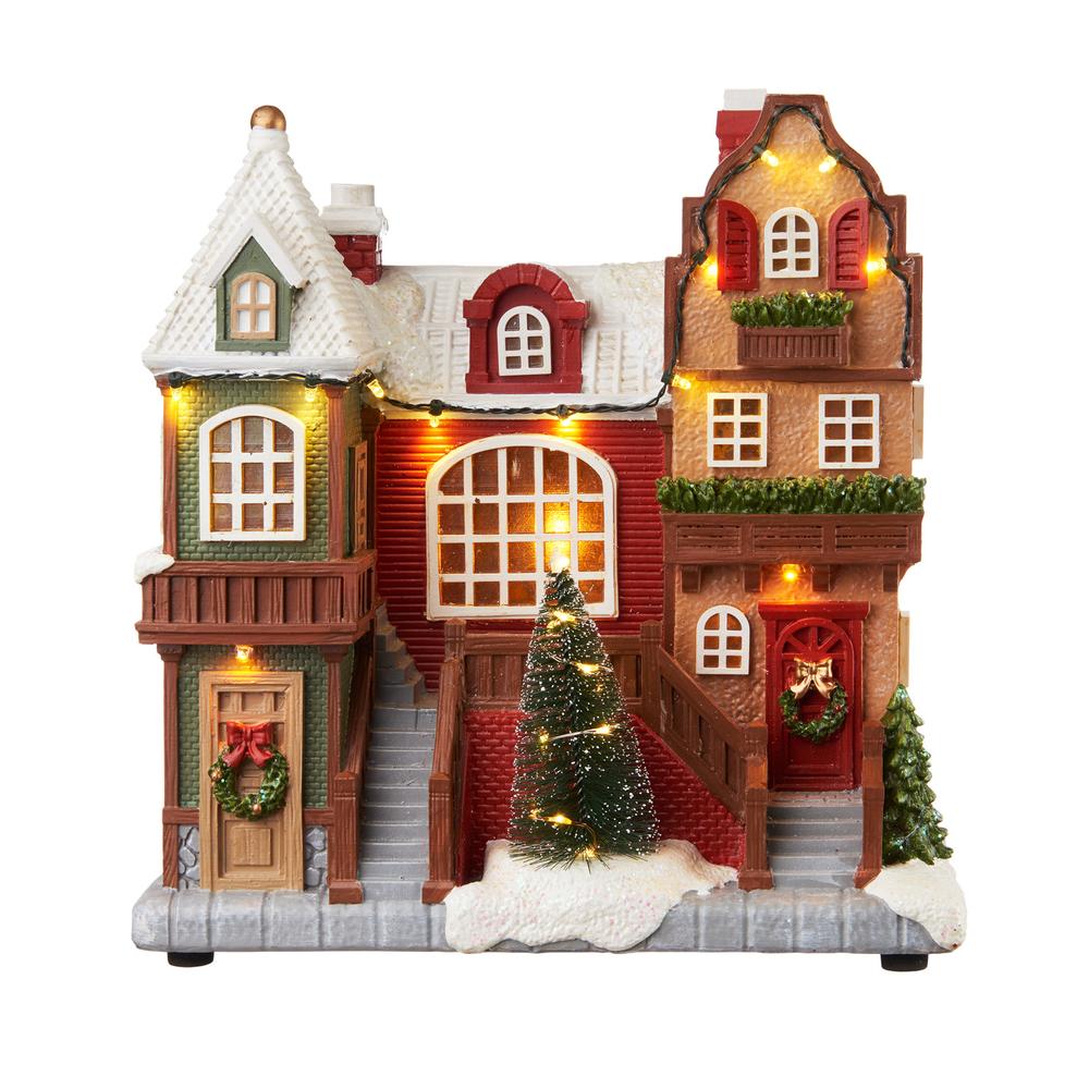 Casetta Happy Village con luci LED e musica – 27,5 x 15,5 x 28,5 cm. Una scenografica casa in stile villaggio invernale che regala atmosfere calde e suggestive: le luci LED illuminano finestre e dettagli, mentre la musica integrata crea un sottofondo festoso ✨🎶. Finiture curate e colori armoniosi donano carattere a centrotavola, madie e vetrine, per un angolo incantato durante la stagione delle feste, firmata L’Oca Nera.