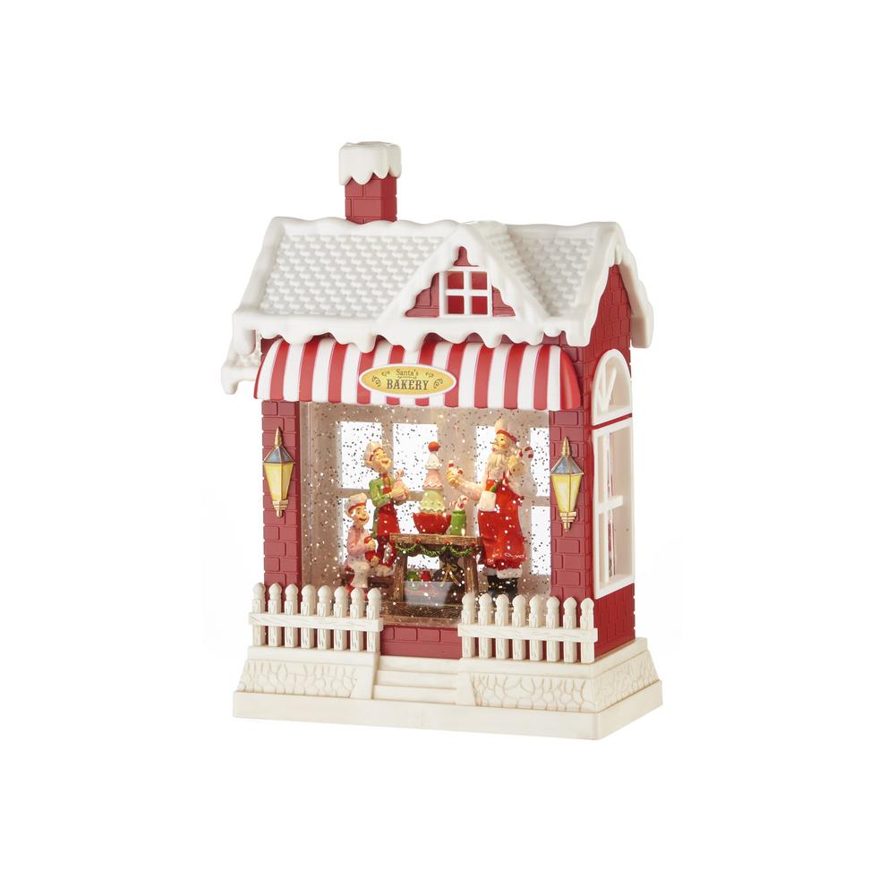 Boule de neige “Santa’s Cookies Bakery” rosso e bianco con musica, LED, movimento continuo e timer integrato – 18 x 9,5 x 25 h cm 🎄