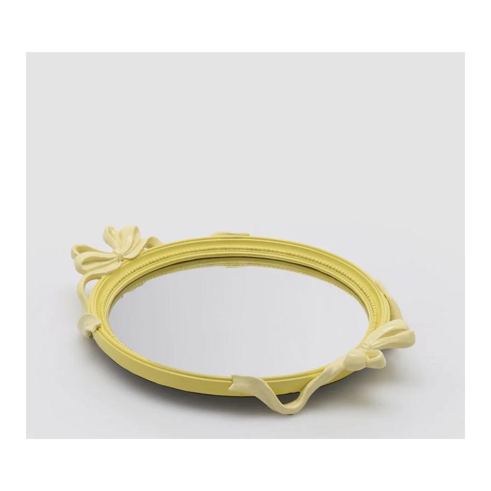 Vassoio decorativo ovale giallo con fiocchi, cornice in poliresina e base a specchio 37x29x5 cm